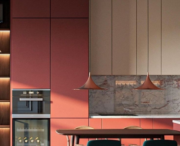 Materiales: productos innovadores, sostenibles y tecnológicamente avanzados, como superficies de cuarzo, terrazo, colores lisos al alto brillo y luces indirectas